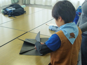 大きい紙で、カブト作り